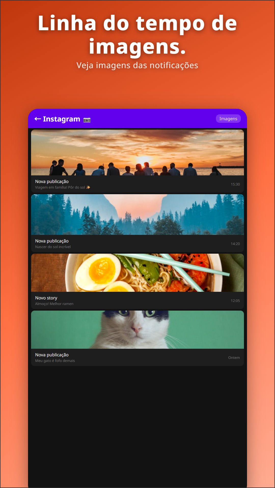 Explore as fotos que chegaram em notificações — miniaturas do YouTube dos canais que você segue, lembranças "neste dia" do Google Fotos, fotos enviadas pelo WhatsApp, miniaturas de notícias, postagens do Instagram. Se uma notificação trouxer uma foto, ela é salva.